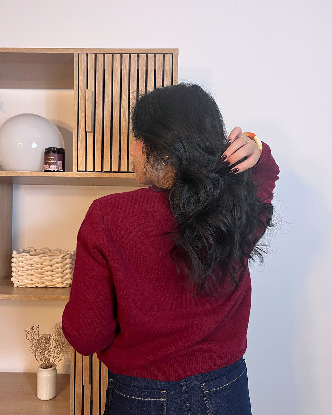 Gilet Mana bordeaux en laine 100 %, à la coupe droite et aux boutons brillants, idéal à porter seul ou superposé en mi-saison.